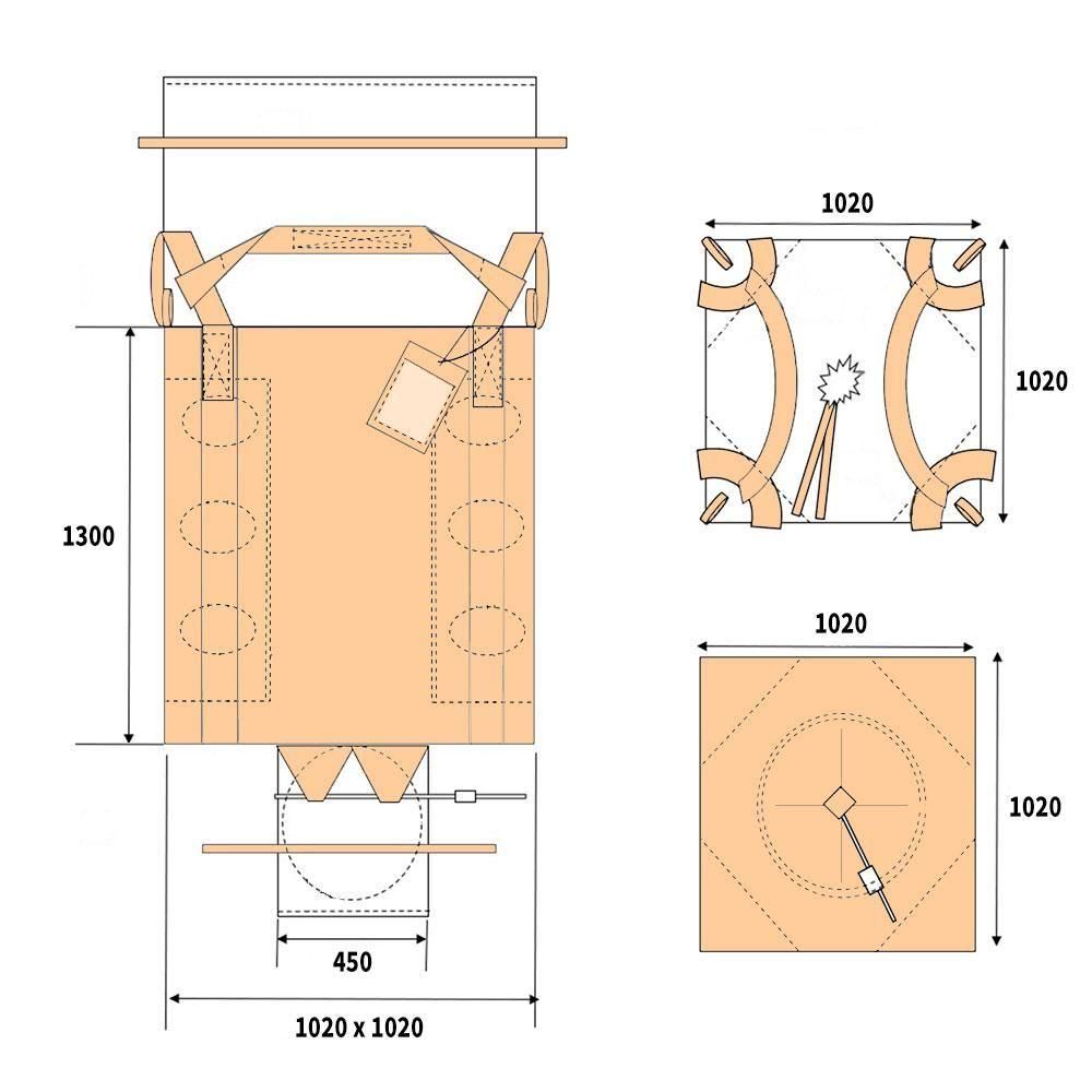 ・角型 ・縦1020 x 横1020 x 高さ1300mm (縦102 x 横102 x 高さ130cm) ・投入口全開(上部全開) ・排出口あり(下部半開):直径450mm(直径45cm) |